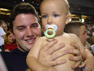 We got to go to a Round Rock Express Baseball game last night. We had so much fun. Peyton loved watching the game and everything else going on. On home runs they shoot off fireworks and he thought that was the best. He also loved all of the music they played. He even got on the big screen while he was dancing to the music. It was so cute. He got a little hot towards the end of the game and I took off his shirt, all he needed was for us to paint his chest :)